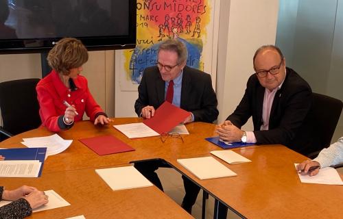 La directora de l'Agència Catalana del Consum (ACC), Beth Abad; el president del Gremi de Tintorers i Bugaders de Barcelona, Antonio Puértolas; i representants del Consell de les Persones Consumidores de Catalunya, Carme Sabater –en nom de la Coordinadora d'Usuaris de la Sanitat, Salut, Consum i Alimentació (CUS)– i Salvador Domínguez –de la Unió de Consumidors de Catalunya (UCC) –, han signat avui el Codi de conducta dels establiments de neteja tèxtil, amb l’objectiu de millorar la defensa i la protecció de les persones consumidores i reduir l’impacte sobre el medi ambient d’aquests serveis.